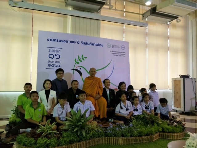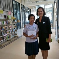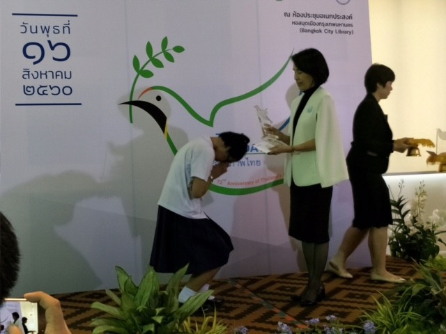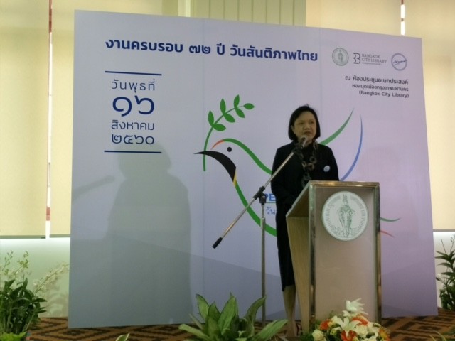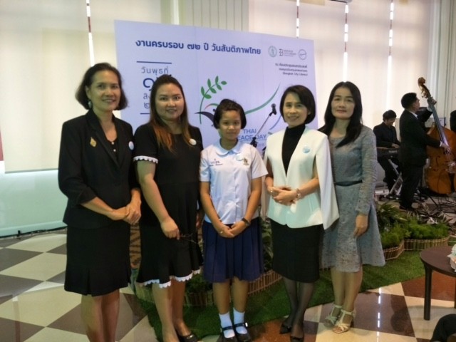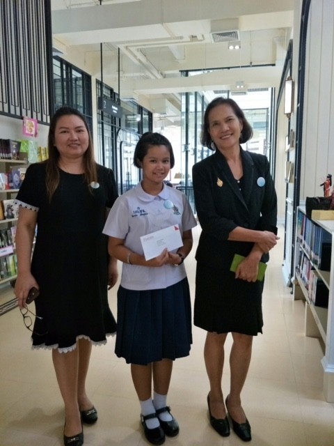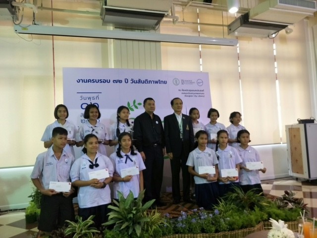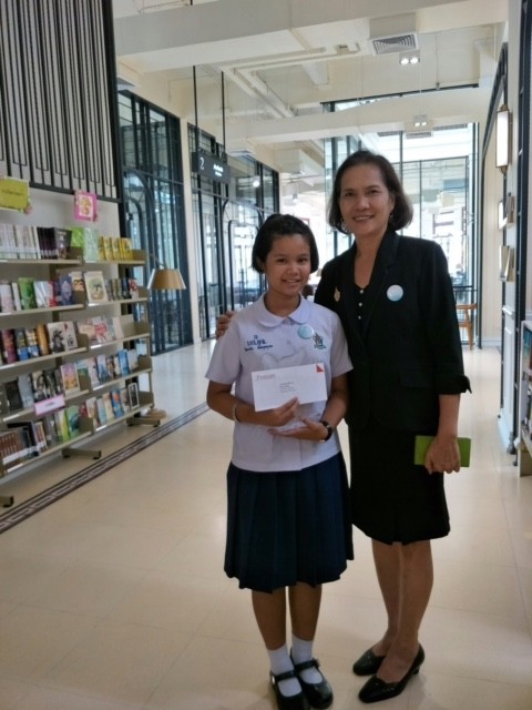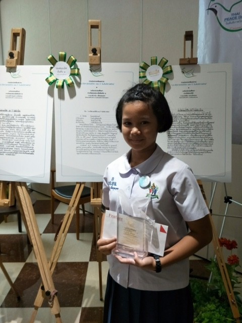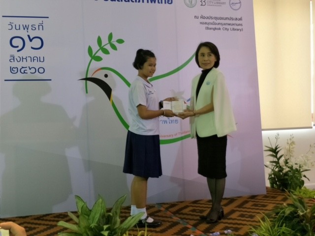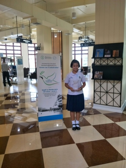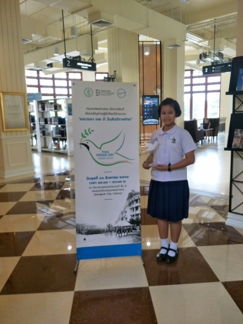เด็กหญิงสิตานัน เพื่อกุลบุตร นักเรียนชัั้นประถมศึกษาปีที่ 5 เข้ารับรางวัลรองชนะเลิศการประกวดเรียงความ เนื่องในงานครบรอบ 72 ปี วันสันติภาพไทย ณ ห้องประชุมเอนกประสงค์ หอสมุดเมืองกรุงเทพมหานคร |