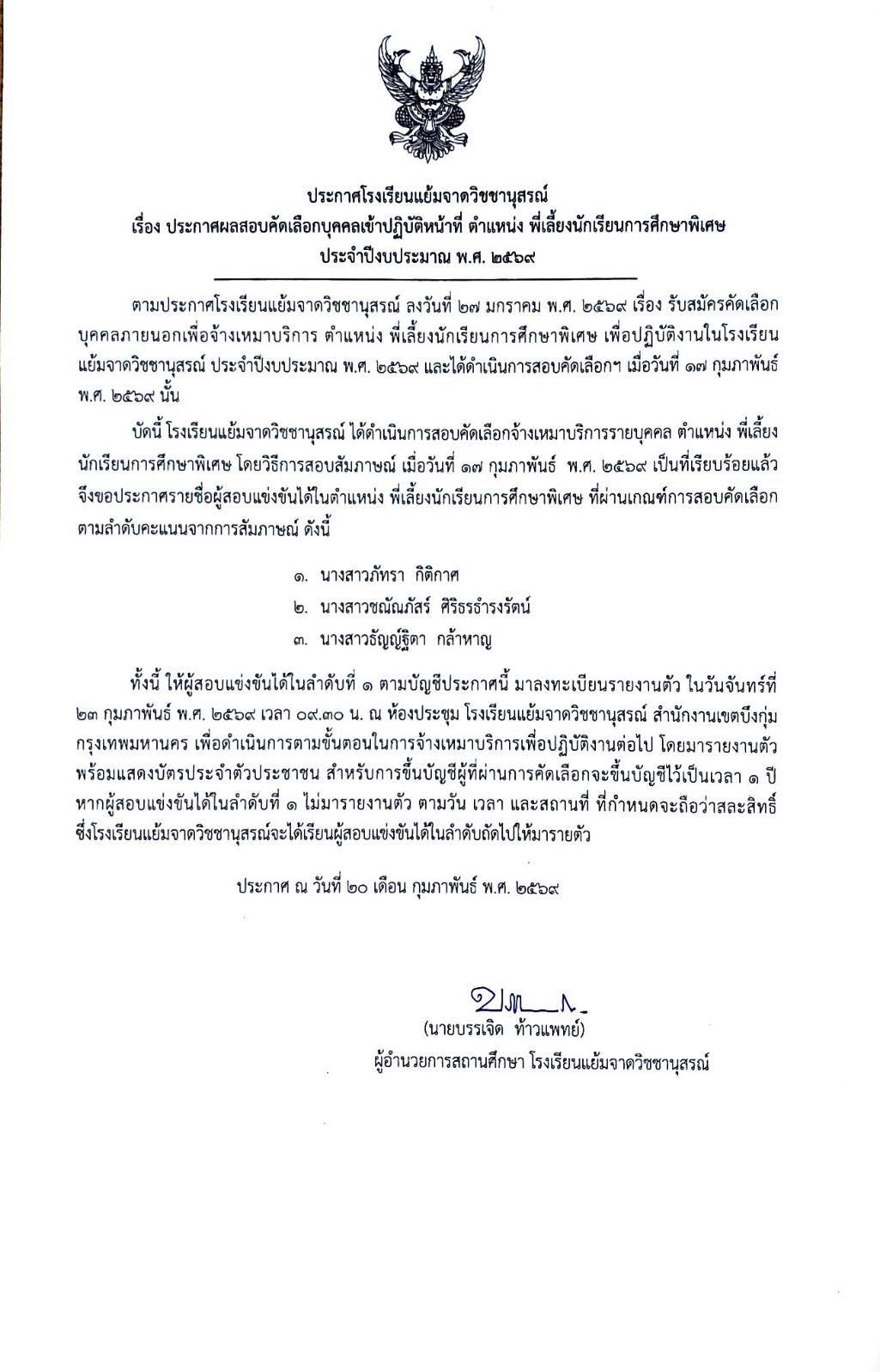 | ประกาศรายชื่อ ผู้สอบสัมภาษณ์ ผ่านการคัดเลือกปฏิบัติหน้าที่พี่เลี้ยงนักเรียนการศึกษาพิเศษ ให้ผู้เข้าสัมภาษณ์ ลำดับที่ 1 เข้ารายงานตัวในวันที่ 23 กุมภาพันธ์ 2569 |